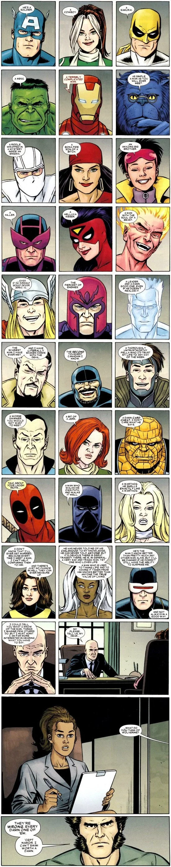 This humorous excerpt from Wolverine #16 (2011) has some of Marvel's most iconic characters sharing their brief thoughts on Wolverine. Writer Jason Aaron and artist Goran Sudzuka do a great job encapsulating each character and their relationship with the adamantium-bladed hero.