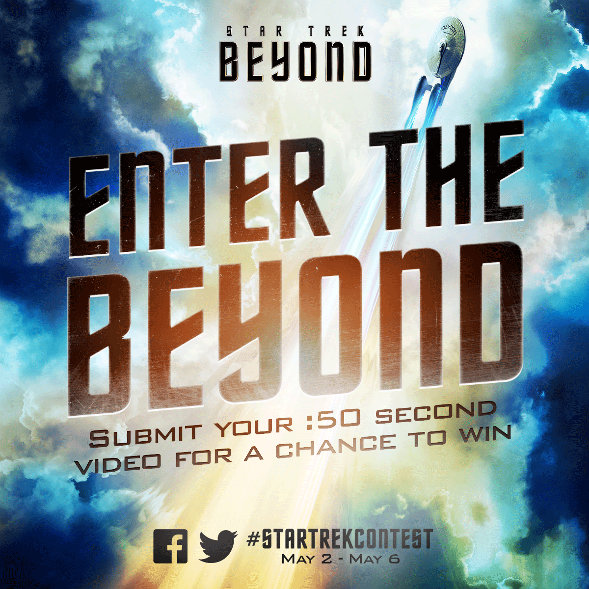 Beginning today through Friday, May 6, fans can submit a 50-second video to the official “STAR TREK BEYOND” Facebook page and Twitter account to share how Star Trek has inspired them to “Go Beyond.” Each day, the best 50 entries will be selected to receive a ticket to the STAR TREK FAN EVENT on May 20 at 7:00 p.m. at the historic Paramount Pictures Studios in Hollywood. The highest judged video of each day will be awarded the grand prize, a fully paid trip to the event.