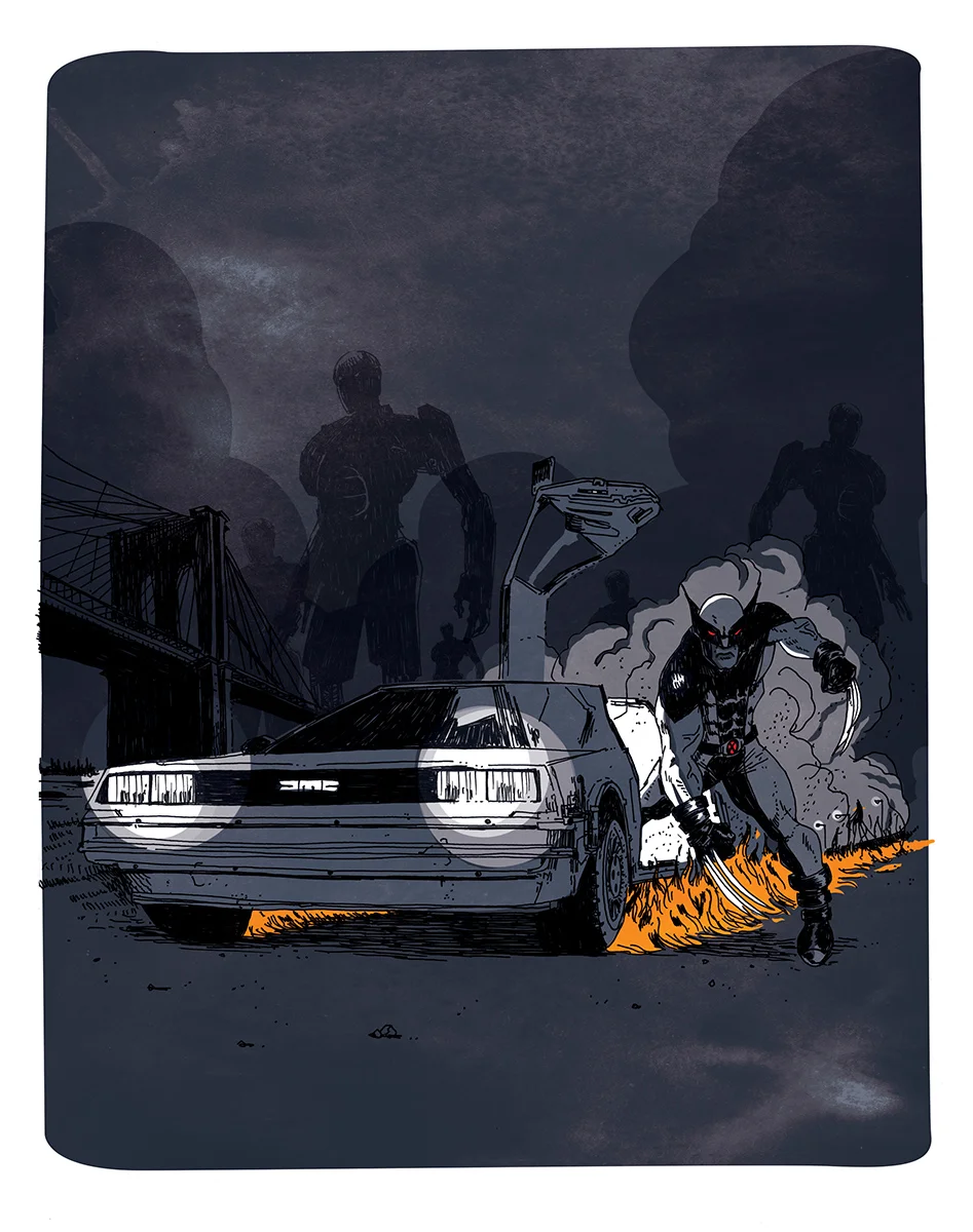 This mashup comes courtesy of artist DaCoffeeTime for a French magazine called Geek Le Mag (via XombieDirge), and it's a perfect blend of the X-Men and Back to the Future universes. Though it was Kitty Pryde who did the time travelling in the X-Men: Days of Future Past comic, director Bryan Singer reworked the story to make Wolverine the time-traveler in last year's movie, so giving him a DeLorean makes a weird kind of sense. Plus, it just looks awesome, and it has a great sense of motion to it - almost as if Wolverine is so pissed off that he's getting out of the vehicle as it's still coming to a stop. Nice work!