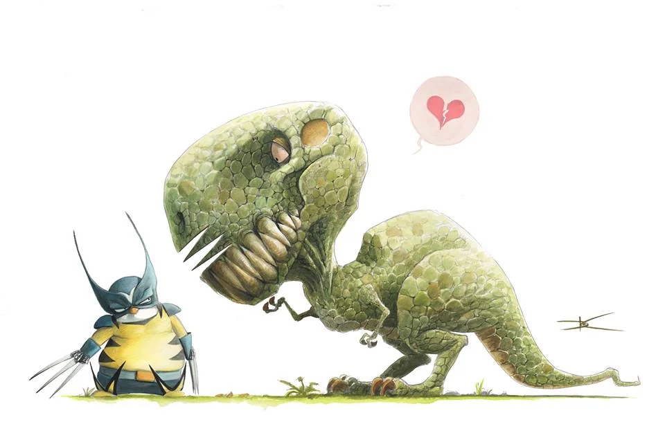 Artist David Cochard created this humorous Wolverine vs. Jurassic Park illustration. I love the expression on Wolverine's face after having taking a chunk of flesh out of the nose of the T-Rex. The character design work is incredibly fun as well.
