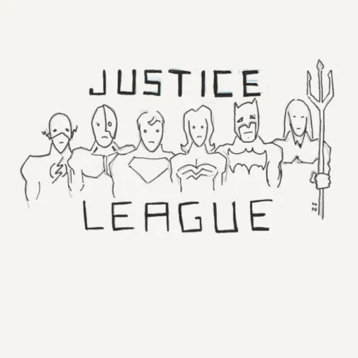 We have a batch of fairly sparse behind the scenes photos and a doodle for Justice League that the Zack Snyder shared on a new social network Vero. Maybe it's just me, but all those heroes in that doodle look miserable. I wonder if Snyder drew this. Does Snyder not like happy heroes? [Have you not seen any of his movies? —ed.]