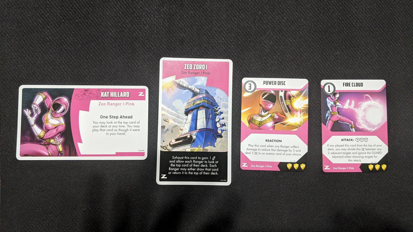 Let’s start with Kat Hillard, Zeo Ranger I Pink. Kat’s awesome power is that she can look at the top card of her deck and play it (spending any energy needed of course). This effectively extends her hand and can make her a bit more flexible. Certain cards also get bonus effects if played from the deck. This can also be used to keep Kat’s hand count low and her deck count high, providing her with more health. Zeo Zord I then allows other Rangers to look at their top cards and either draw them or leave them on top. This is a really cool mechanic.