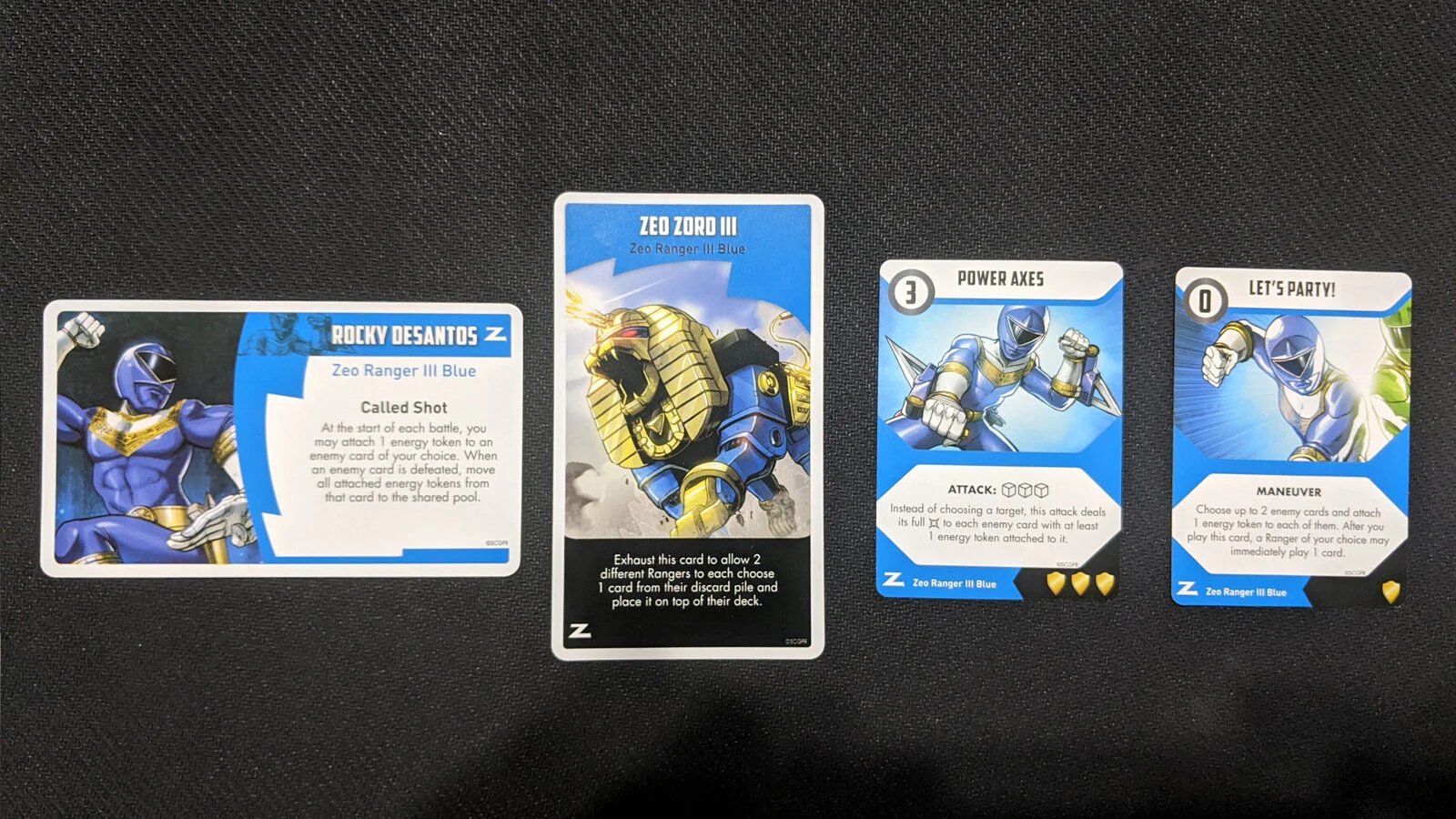 Next is Rocky DeSantos or Zeo Ranger III Blue. His whole thing is putting energy tokens on enemy cards and then gaining boosts or other effects that target those tokens which you’ll then be able to claim and use for devastating attacks. Zeo Zord III allows Rangers to recover cards from their discards. I would chalk Rocky up to a support role, but a very valuable one.