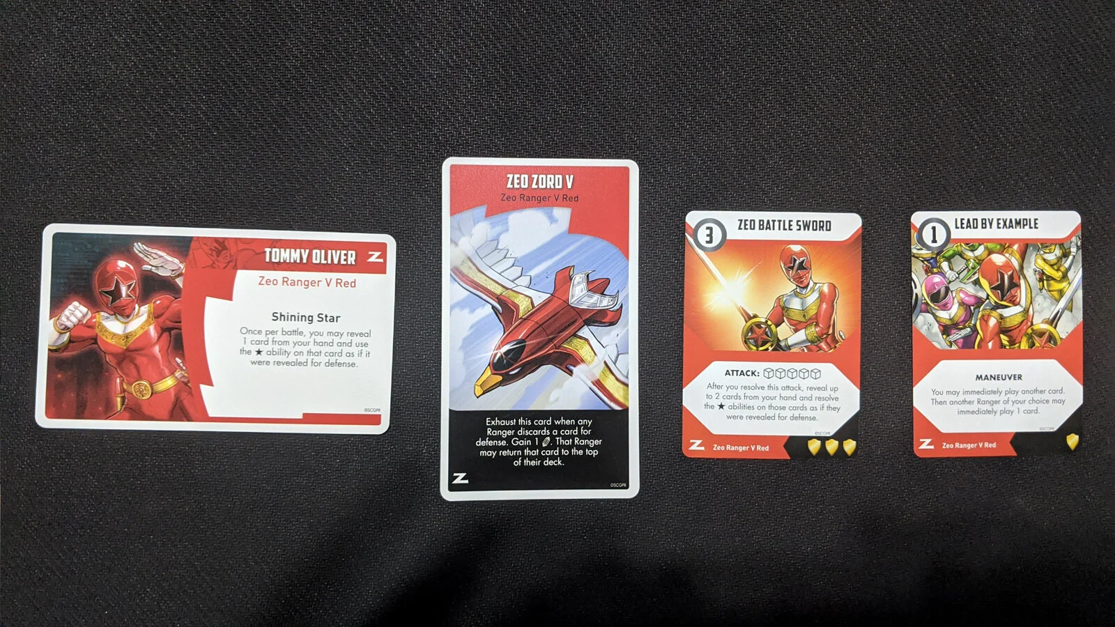 The famous Tommy Oliver leads the team as Zeo Ranger V Red. His cards have a special star icon with an effect that typically triggers when the card is revealed for defense but once per battle, he can just use one of the star abilities. These tend to be pretty powerful like adding dice, gaining energy, or recovering cards. Zeo Zord V helps gain energy and recover a card.